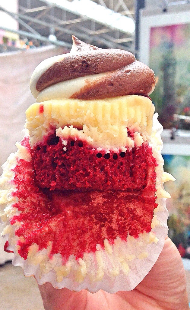 Quando eu mordi aquele bolinho, foi uma explosão de sabores! Era molhado na medida certa, tinha tipo de uma cobertura mais densa de chocolate branco, que lembrava um cheesecake e então o buttercream de baunilha e chocolate.