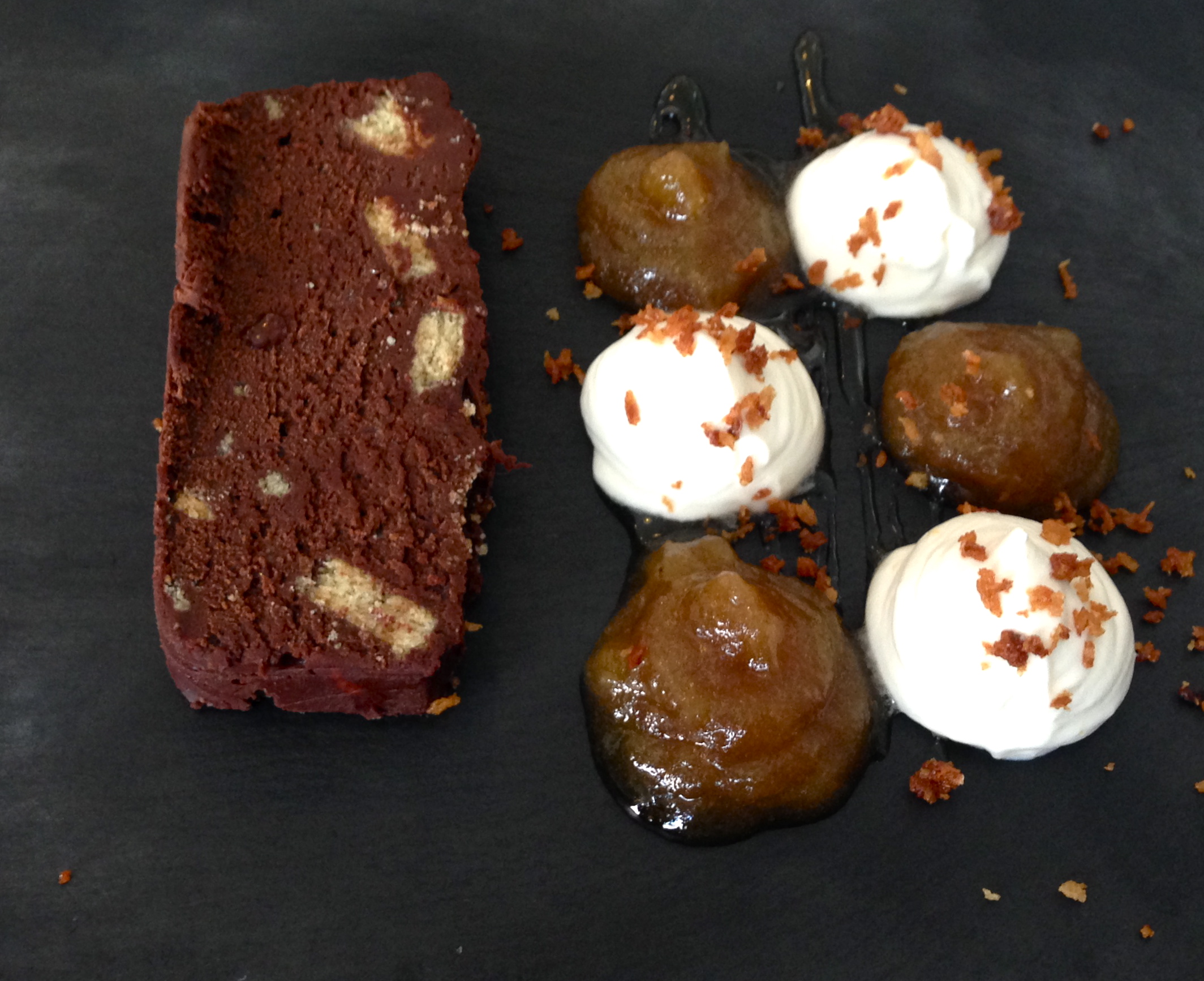 Uma opção era um bolo brownie com chutney de maçã e creme e a outra era uma mini panqueca coberta com mapple e sorvete de blueberry.