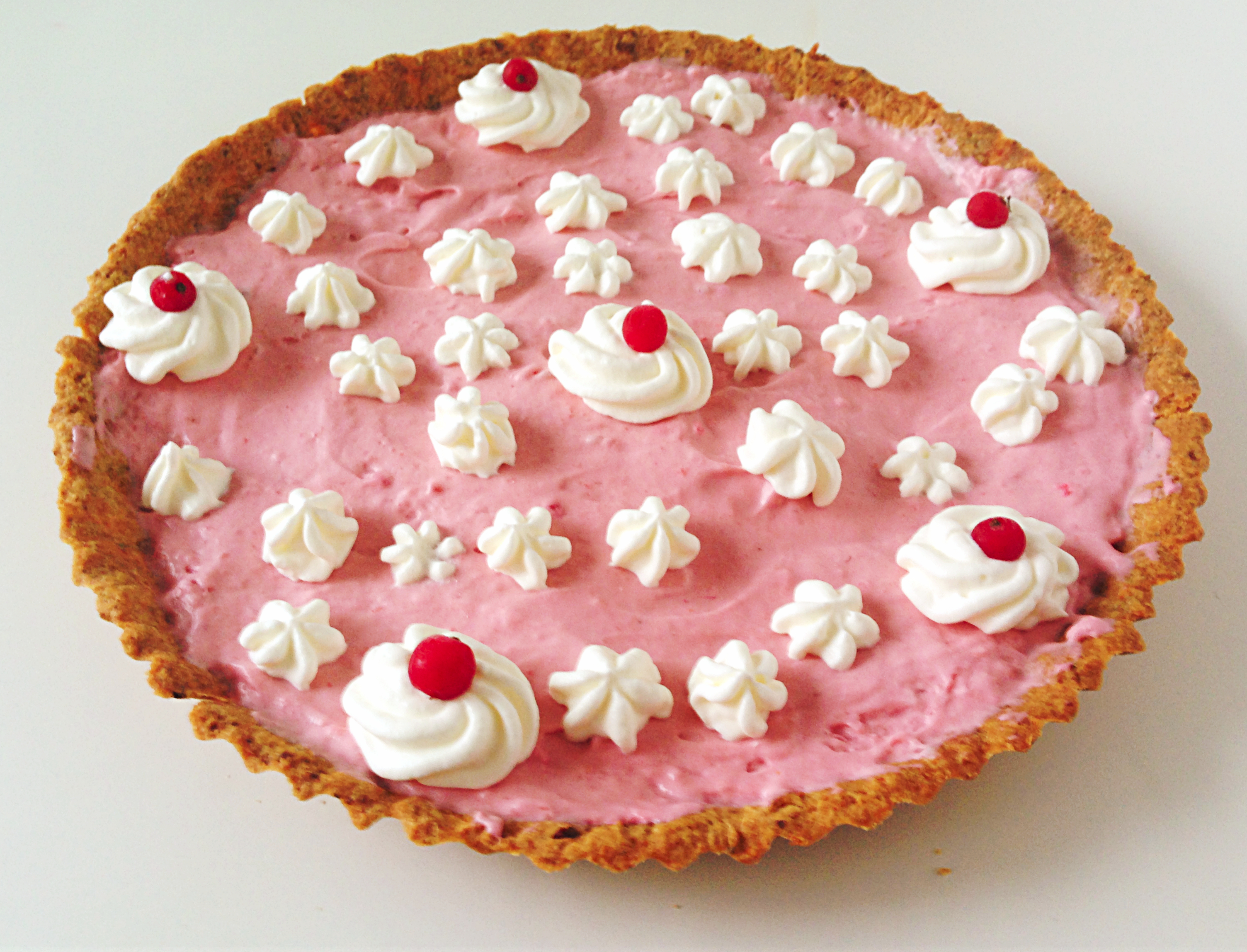 E acredito que essa torta ficaria deliciosa com uma calada de chocolate em cima do moesse de framboesa!