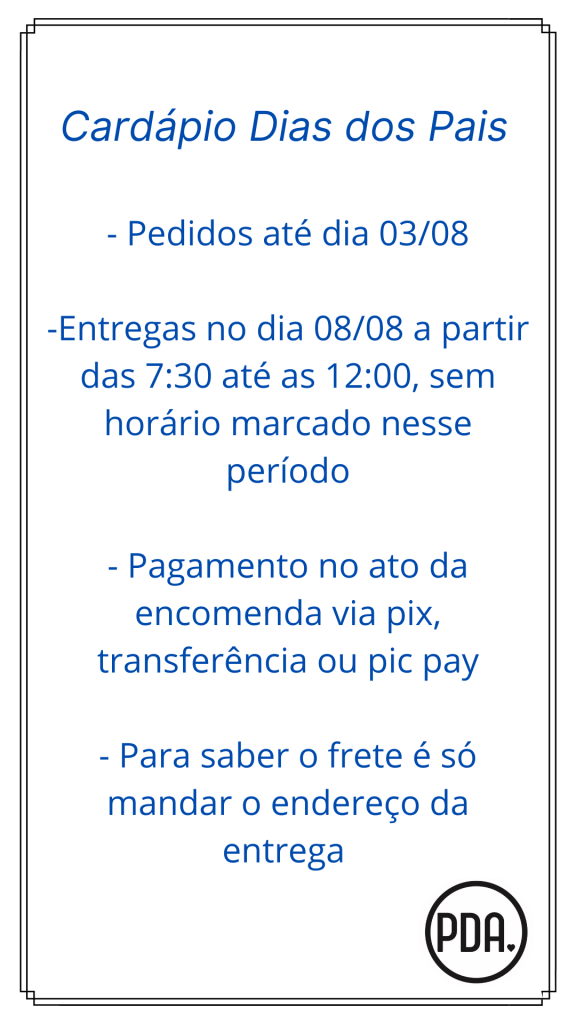 O pagamento é feito 100% no ato da encomenda e pode ser feito por pix, transferência ou pic pay para cartão de crédito!