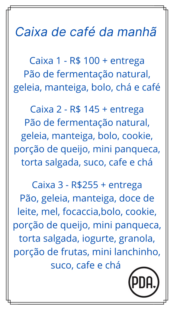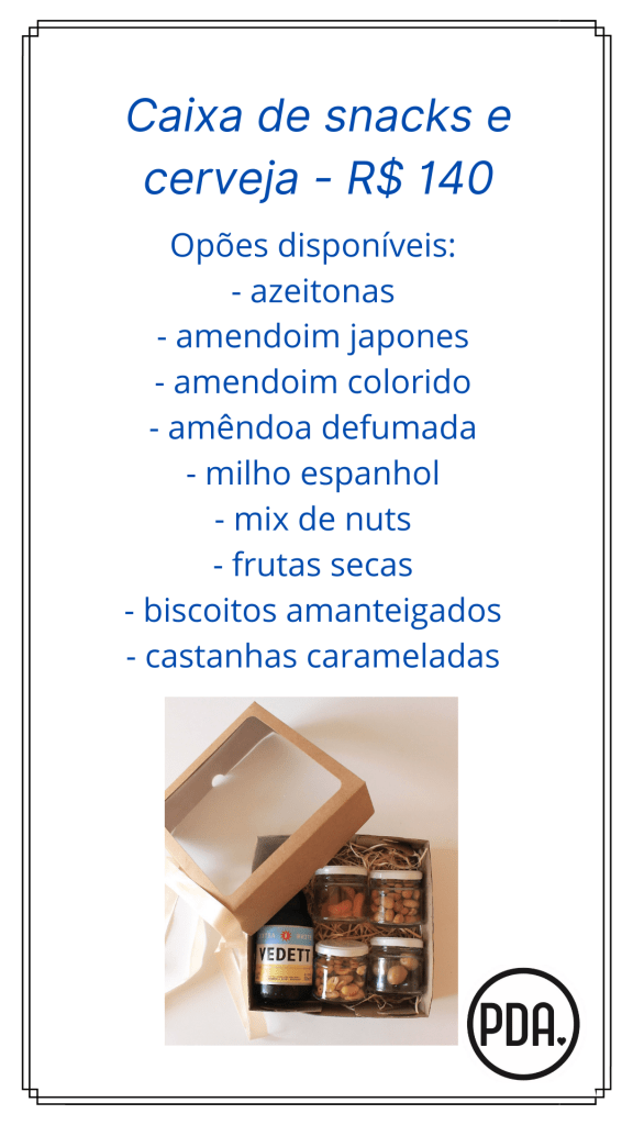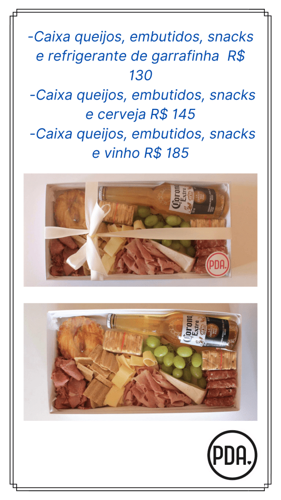 Tem caixa de café da manhã, kit happy hour com snacks, kits happy hour mais completos!